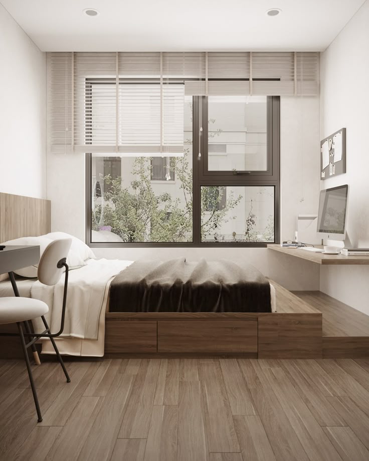 Nếu có thể đừng ngại việc mở rộng cửa sổ kính trong phòng ngủ. Nó có thể thay thế cả bức tường nếu cần thiết. Lắp đặt các cửa sổ lớn hơn cho phép nhiều ánh sáng tự nhiên vào không gian hơn, tạo cảm giác thoáng và rộng rãi hơn. Ánh sáng tự nhiên cũng có thể nâng cao tâm trạng và bầu không khí của căn phòng. Kiểm soát sự riêng tư cho cửa sổ bằng rèm cửa hoặc phim dán kính.